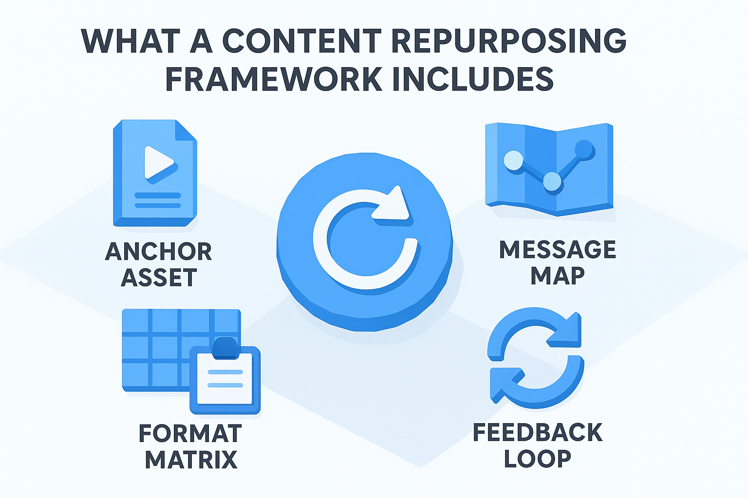 A content repurposing framework is not just a checklist you run through once. It's a repeatable production system built around four core components: a high-value source asset, a structured message map, a format matrix, and a feedback loop. Each component feeds the next, so every time you run the system, your output gets faster and more targeted. Skip one layer and the whole thing collapses into the same ad-hoc content creation you're trying to escape.