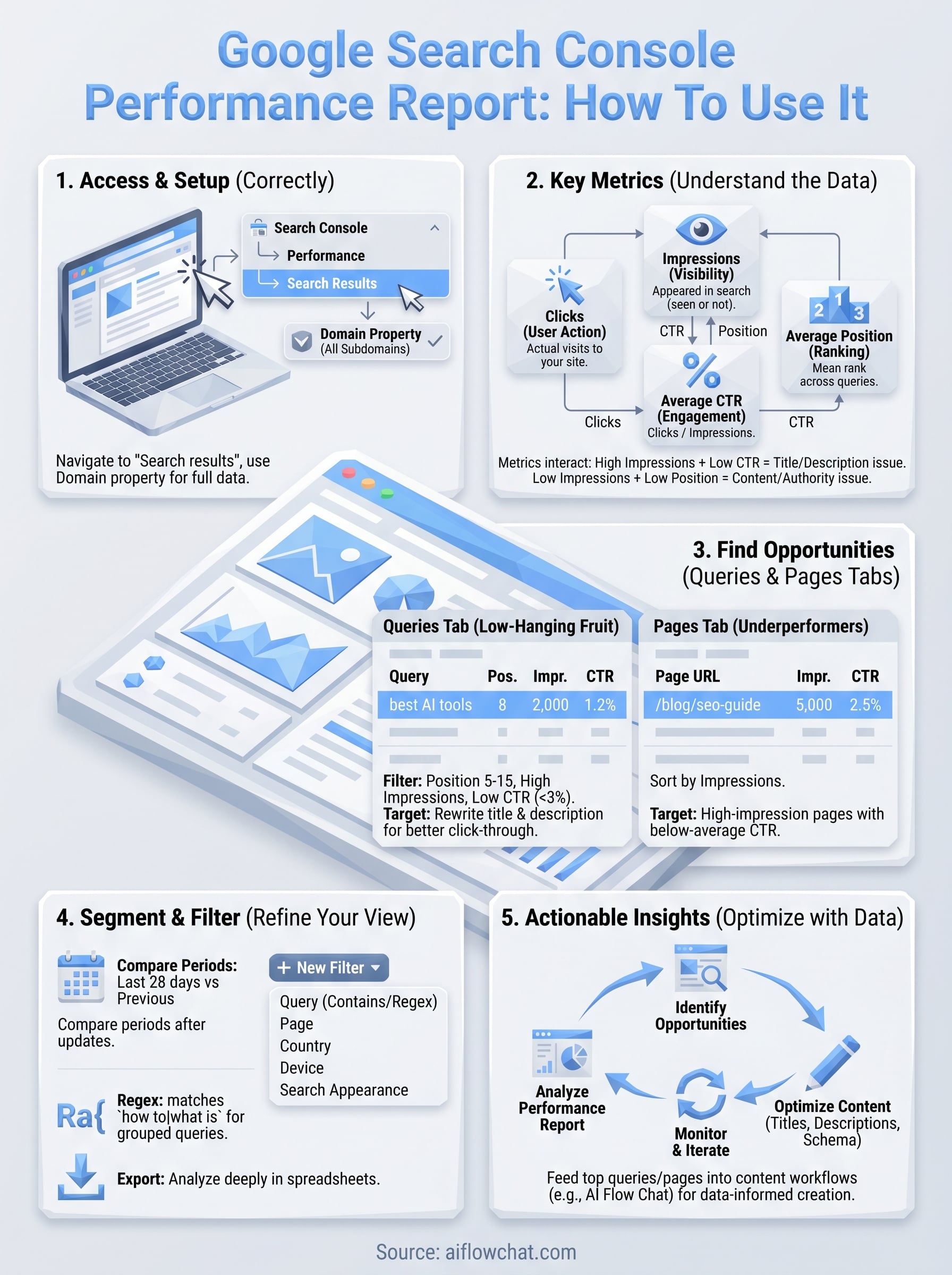 This guide walks you through everything you need to know about the performance report: how to access it, what each metric means (clicks, impressions, CTR, average position), and how to pull actionable SEO insights from the data. Whether you're an SEO specialist, a solopreneur managing your own blog, or an agency owner reporting to clients, you'll leave with a clear understanding of how to use this report to improve your search visibility.