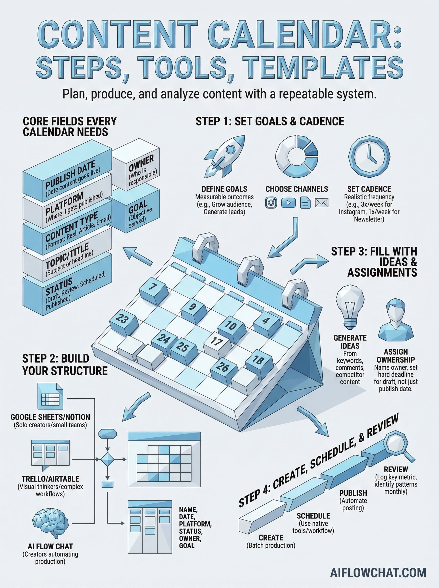 Your calendar will break occasionally. Posts get delayed, priorities shift, and some ideas just don't pan out. That's fine. Update the rows, adjust the dates, and move on without letting one missed post derail the entire schedule. The goal is consistency over perfection. If you want to speed up the production side and connect your planning directly to content generation, try AI Flow Chat to build visual workflows that take your calendar from plan to published draft faster.