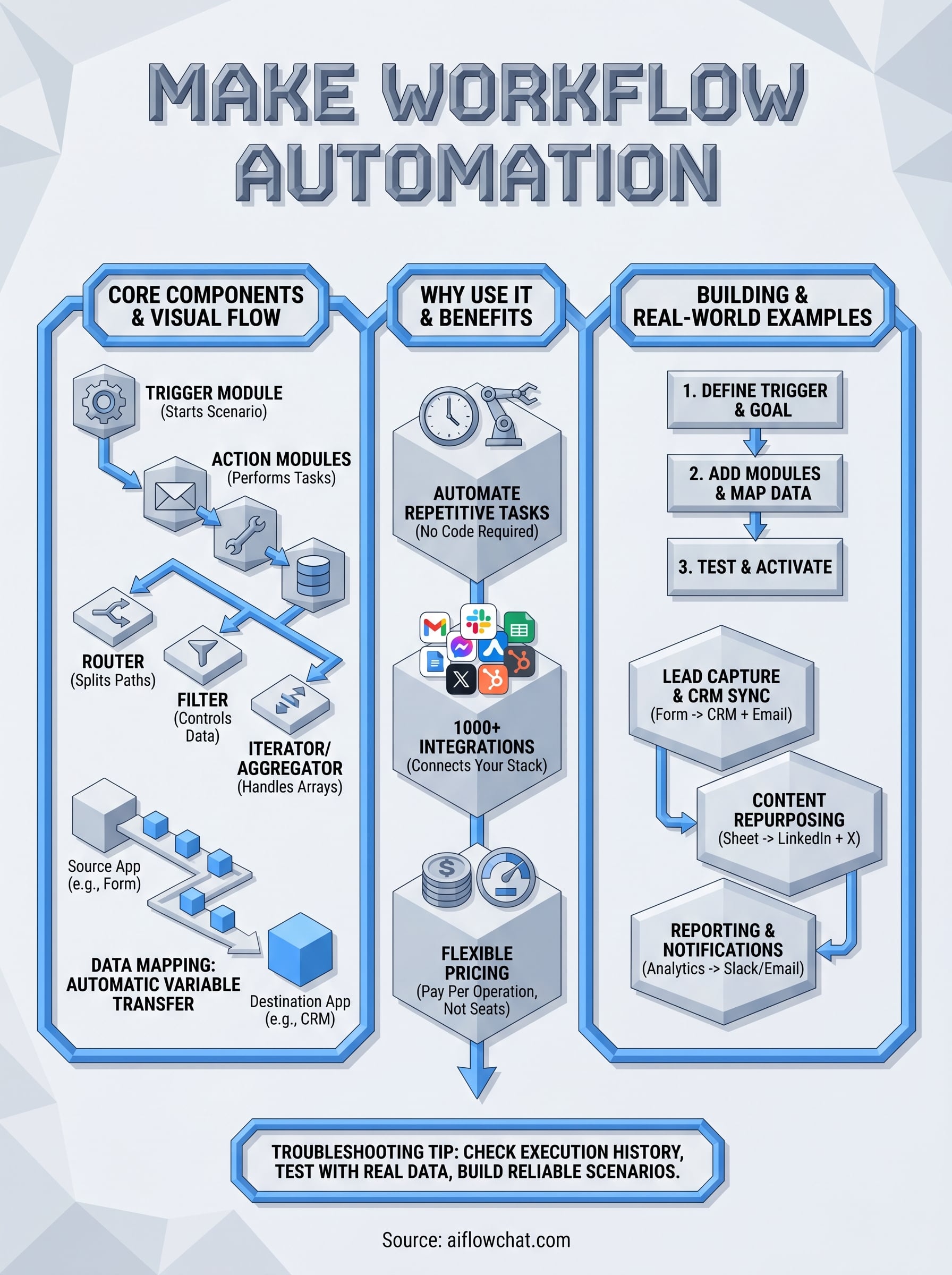 Make workflow automation refers to building sequences of connected app actions on the Make platform, where one event triggers a chain of steps that move data between your tools automatically. Make uses a visual, flowchart-style interface called the scenario builder, and you construct automations by dragging modules onto a canvas and linking them together. The platform supports thousands of app integrations, which means you can connect tools like Gmail, Google Sheets, Airtable, Slack, HubSpot, and hundreds more without writing a single line of code. When you make workflow automation work on this platform, you are essentially telling your apps what to do and in what order, so you can stop doing repetitive tasks by hand.