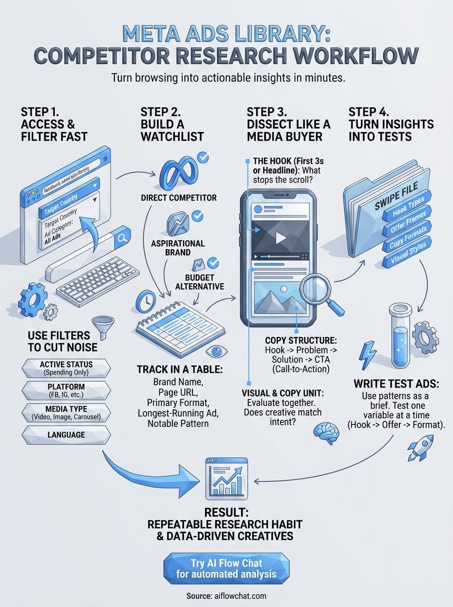 At AI Flow Chat, we built our platform around this exact workflow: feeding competitor ads and viral content directly into AI to reverse-engineer what's working, then generating new creatives and copy in your own voice. This guide walks you through how to use the Meta Ads Library step by step, so you can research competitor ads in minutes and walk away with insights you can actually use.