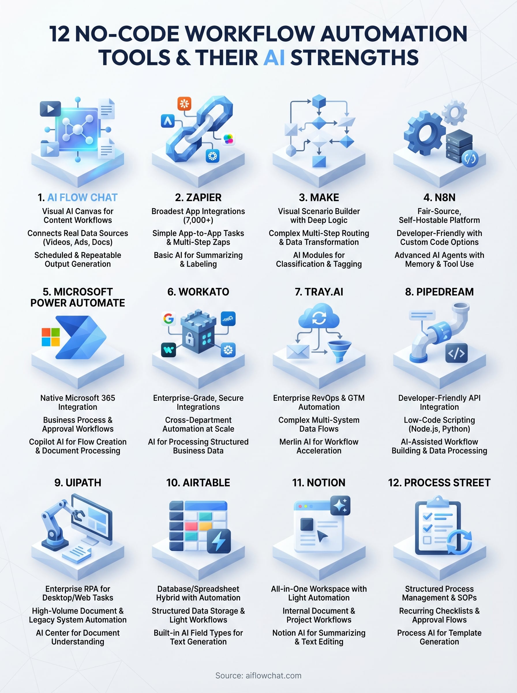 We built AI Flow Chat around this exact idea: a visual canvas where creators and marketers build AI workflows by dragging in sources like videos, ads, docs, and websites, then connecting them to prompts that run on demand or on a schedule. So we have strong opinions about what makes a no-code automation tool genuinely useful versus just good at demos. This guide covers 12 platforms that handle AI-driven automation well right now, including ours, with an honest look at what each does best and where each one falls short.