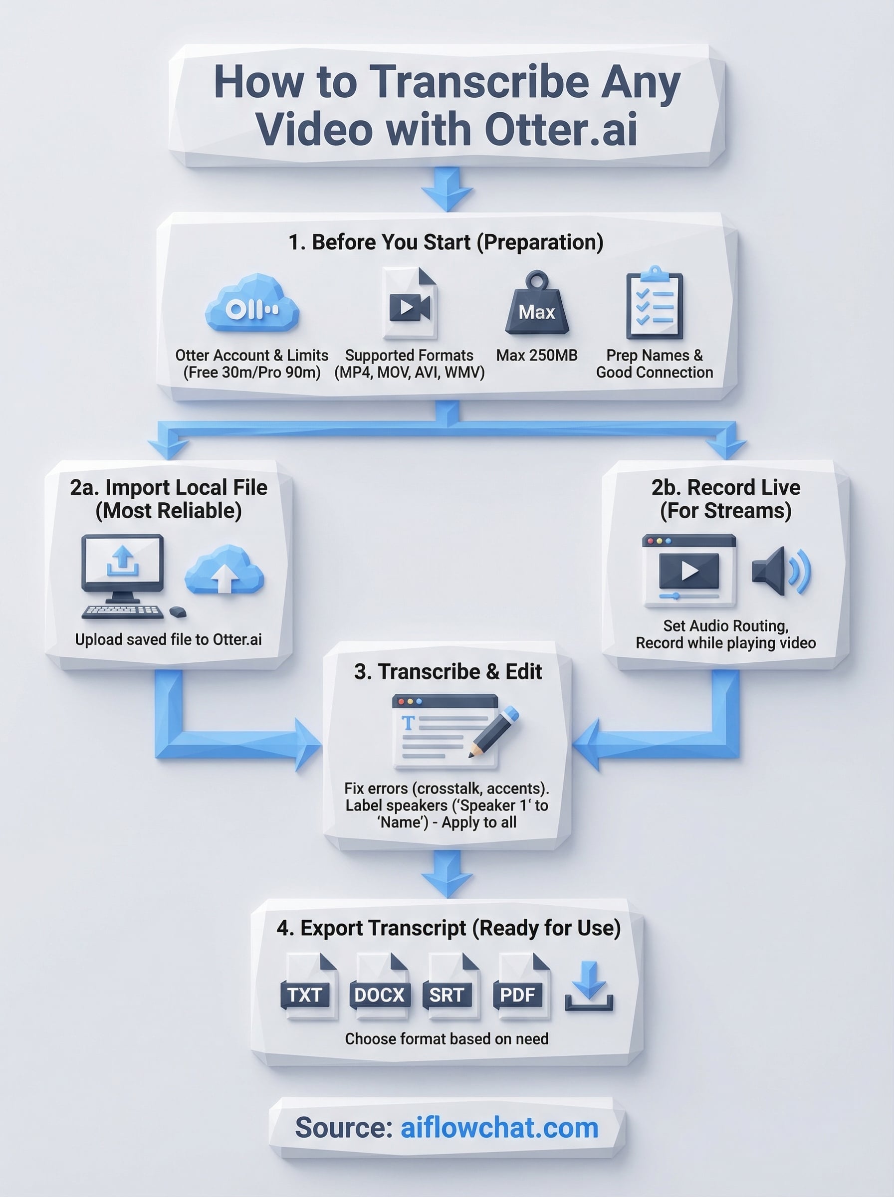 Otter AI video transcription gives you a fast, structured way to turn any video into text, whether you're uploading a local file or recording a live stream. The process breaks down into four clear steps: pick your method, run the transcription, clean up the output, and export in the format your next task requires. Following that sequence every time means you spend less time fixing errors and more time actually using what you have.