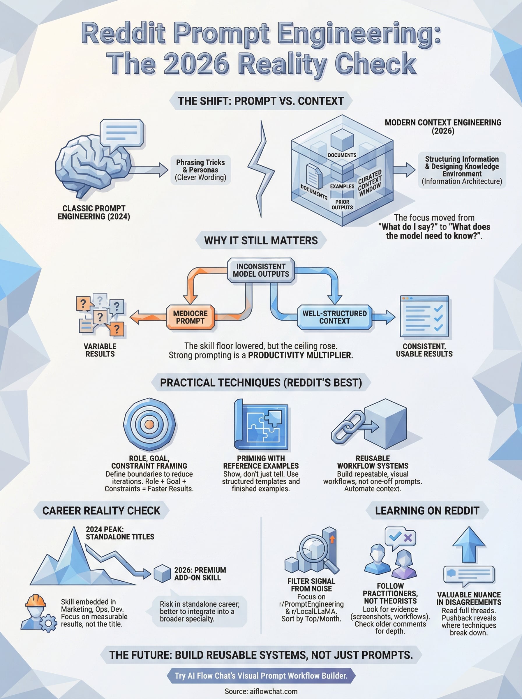 That's something we think about constantly at AI Flow Chat, where our entire platform is built around turning prompts into repeatable, visual workflows. We watch these Reddit debates closely because they reflect real friction points our users face: how to get consistent outputs, how to reference multiple sources without losing context, and how to move beyond basic chat interfaces. So we pulled together the most useful insights, recurring advice, and genuine criticisms from Reddit's prompt engineering communities to give you a single, honest breakdown of where things stand right now.