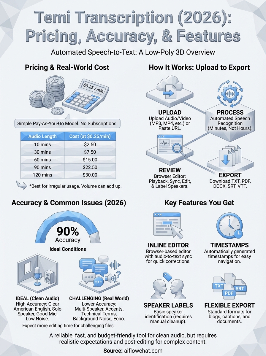 Temi transcription advertises around 90% accuracy under ideal conditions, and that number holds up reasonably well when your audio is clean. A single speaker recorded in a quiet environment with a decent microphone will produce a transcript you can clean up in a few minutes. The raw accuracy starts dropping as soon as those conditions change, and most real-world recordings don't meet the ideal baseline.