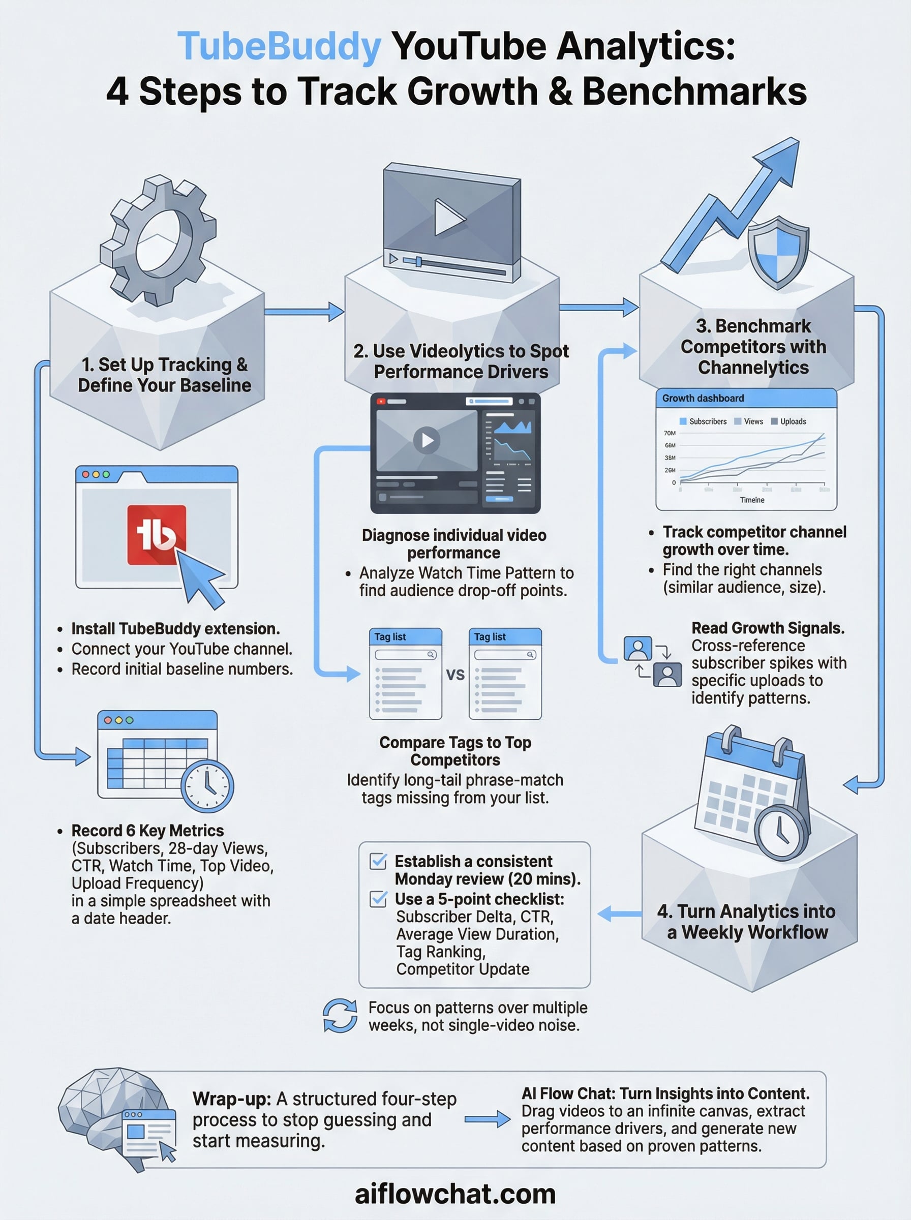 TubeBuddy YouTube analytics gives you a structured way to stop guessing and start measuring. You now have a four-step process: set a baseline, diagnose individual video performance with Videolytics, benchmark competitors with Channelytics, and run a consistent Monday review that keeps your decisions grounded in patterns instead of single-video noise. Each step builds on the last, so skipping one leaves a gap in your analysis.